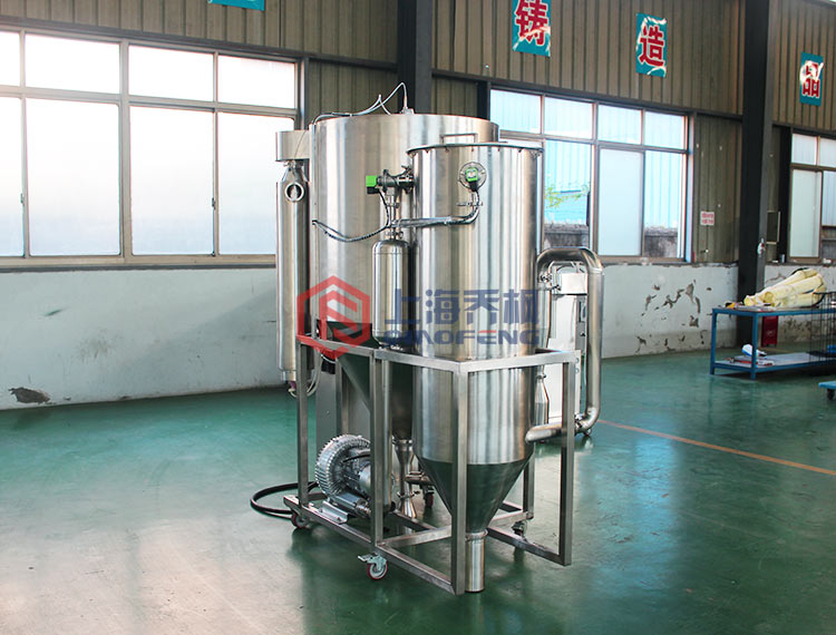 工作過程是料液通過氣動(dòng)隔膜泵高壓輸入,噴出霧狀液滴,然后同熱空氣并流下降,大部分粉粒由塔底排料口收集,廢氣及其微小粉末經(jīng)旋風(fēng)分離器分離,廢氣由抽風(fēng)機(jī)排出,粉末由設(shè)在旋風(fēng)分離器下的收粉筒收集,風(fēng)機(jī)出口處還可裝備二級(jí)除塵裝置,回收率在96%-98%。